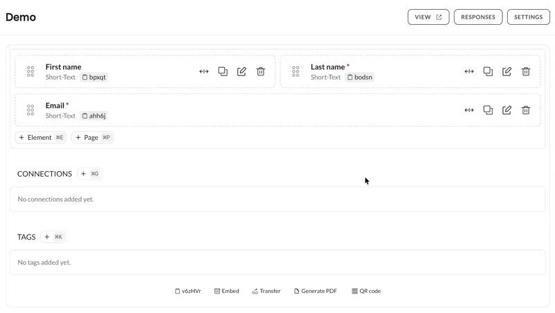 We kept tweaking the form builder and optimized a few things. First, we now show the "Connections" and "Tags" sections even when empty. That should make it clearer that those things exist and where to add them.